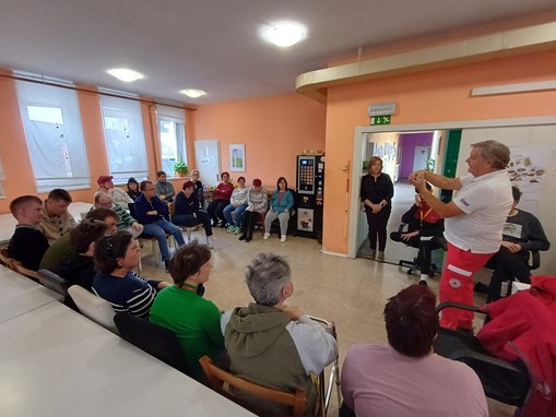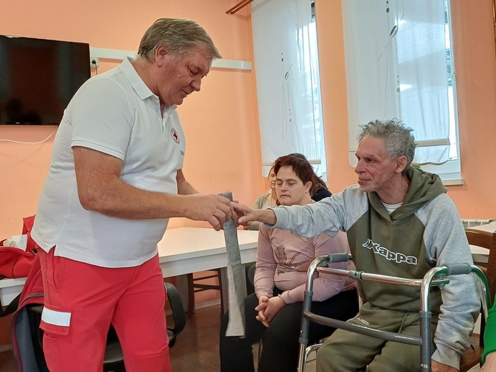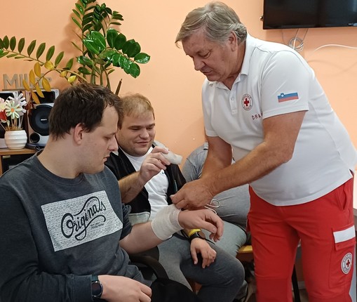 Skozi pogovor z uporabniki je predstavil osnovna ravnanja prve pomoči v primeru odrgnin, ureznin, žuljev, opeklin, padcev, poškodbe glave, ugriza psa, pika ose, čebele, kače in kako ravnamo v primeru različnih krvavitev.
